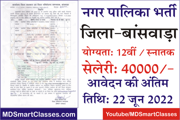 बांसवाड़ा नगर पालिका मे विभिन्न पदों के लिए आवेदन शुरू (Banswara Nagar Palika Bharti 2022) : राजस्थान मे बांसवाड़ा नगर परिषद व बांसवाड़ा जिले की नगर पालिकाओं मे विभिन्न पदों के लिए भर्ती विज्ञापन जारी । मुख्यमंत्री बजट घोषणा वर्ष 2022-23 के अन्तर्गत लागू इन्दिरा गांधी शहरी रोजगार गारन्टी योजना (IRGY-URBAN) के प्रभावी क्रियान्वयन एवं प्रबन्धन हेतु बांसवाड़ा जिले की नगर परिषद् / नगर पालिकाओं में विभिन्न पदों पर संविदा आधार पर नियुक्ति हेतु निर्धारित प्रपत्र में आवेदन आमंत्रित किये जाते है।