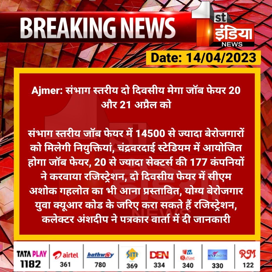 युवाओं को निजी क्षेत्र में रोजगार के अवसर उपलब्ध कराने के लिए ‘अजमेर मेगा जॉब फेयर’ का आयोजन किया जाएगा । इस मेले मे 47 से अधिक कंपनियों में 10 हजार रोजगार प्रदान करेगी । रोजगार चाहने वाले आशार्थी ई- मित्र कियोस्क के माध्यम से आवेदन कर सकते हैं। साथ ही, आवेदन के लिए रोजगार कार्यालय की ओर से एक क्यूआर कोड भी जारी किया गया है।