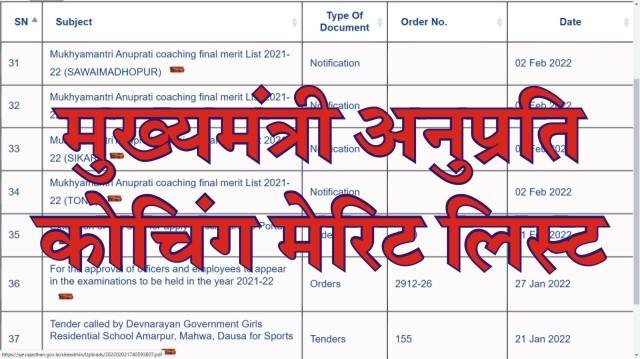 राजस्थान मुख्यमंत्री अनुप्रति कोचिंग योजना मेरिट लिस्ट 2022