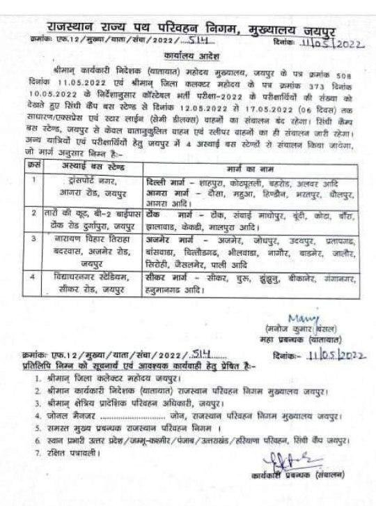 श्रीमान् कार्यकारी निदेशक (यातायात) महोदय मुख्यालय, जयपुर के पत्र क्रमांक 508 दिनांक 11.05.2022 एवं श्रीमान् जिला कलक्टर महोदय के पत्र क्रमांक 373 दिनांक 10.05.2022 के निर्देशानुसार कॉस्टेबल भर्ती परीक्षा 2022 के परीक्षार्थियों की संख्या को देखते हुए सिंधी कैंप बस स्टेण्ड से दिनांक 12.05.2022 से 17.05.2022 (06 दिवस) तक साधारण/एक्सप्रेस एवं स्टार लाईन (सेमी डीलक्स) वाहनों का संचालन बंद रहेगा सिंधी कैम्प बस स्टैण्ड, जयपुर से केवल वातानुकूलित वाहन एवं स्लीपर वाहनों का ही संचालन जारी रहेगा। अन्य यात्रियों एवं परीक्षार्थियों हेतु जयपुर में अस्थाई बस स्टेण्डों से संचालन किया जायेगा, जो मार्ग अनुसार निम्न है