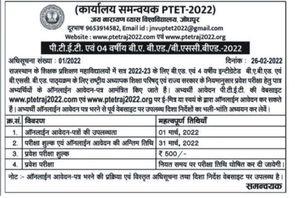Rajasthan PTET 2022 Notification