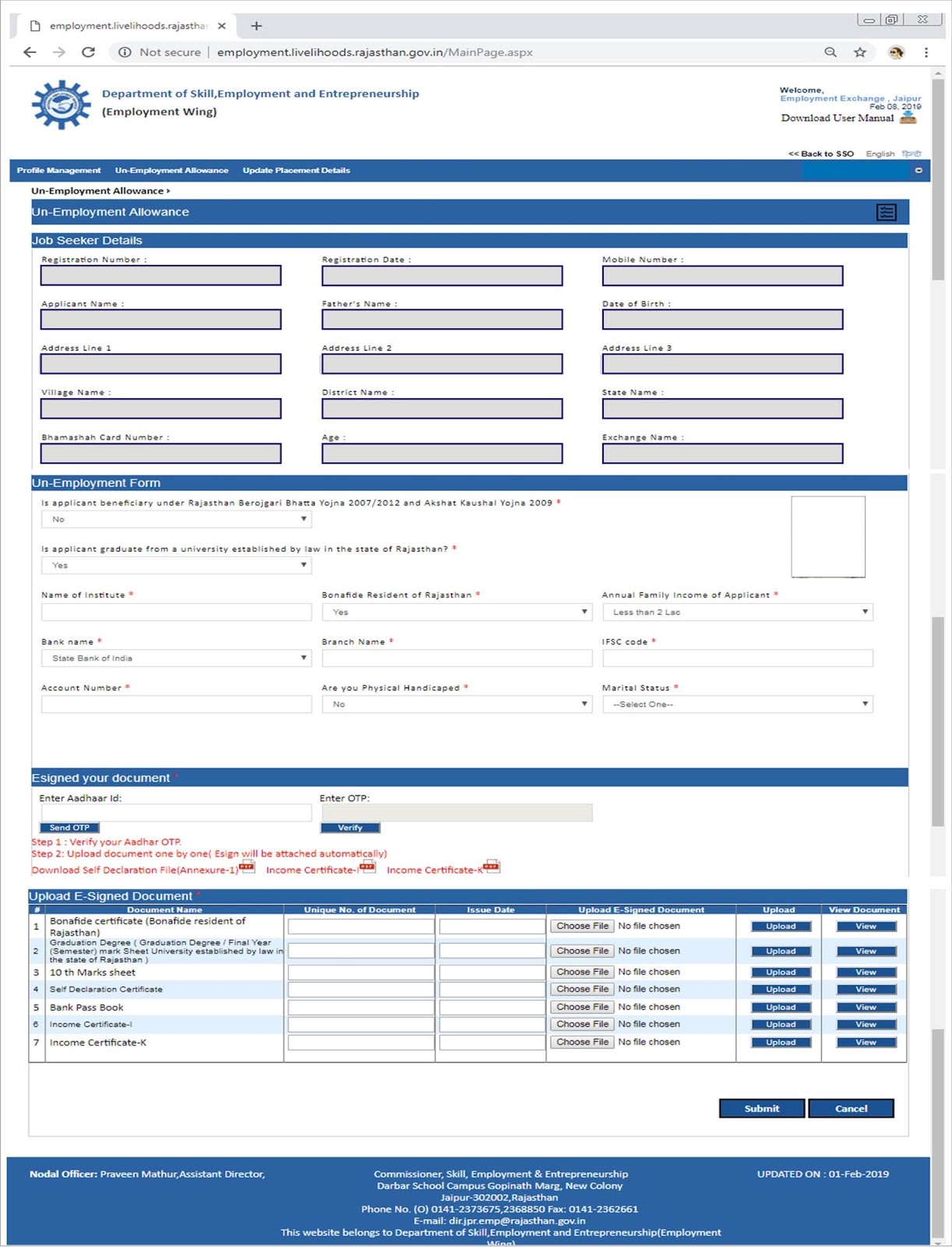 (i) प्रार्थी को बेरोजगारी भत्ता प्राप्त करने के प्रथम वर्ष की समाप्ति पर बेरोजगार होने का आवेदन पत्र बेरोजगार होने संबंधी) ई-साइन कर अपलोड करना होगा। साथ ही प्रार्थी के पारिवारिक वार्षिक आय के संबंध में Annexure-1 तहसीलदार/नोटरी पब्लिक द्वारा प्रमाणित) तथा Annexure -K में अपलोड करना होगा। गलत तथ्यों के आधार पर वार्षिक आय प्रमाणीकरण करना दण्डनीय माना जायेगा।
