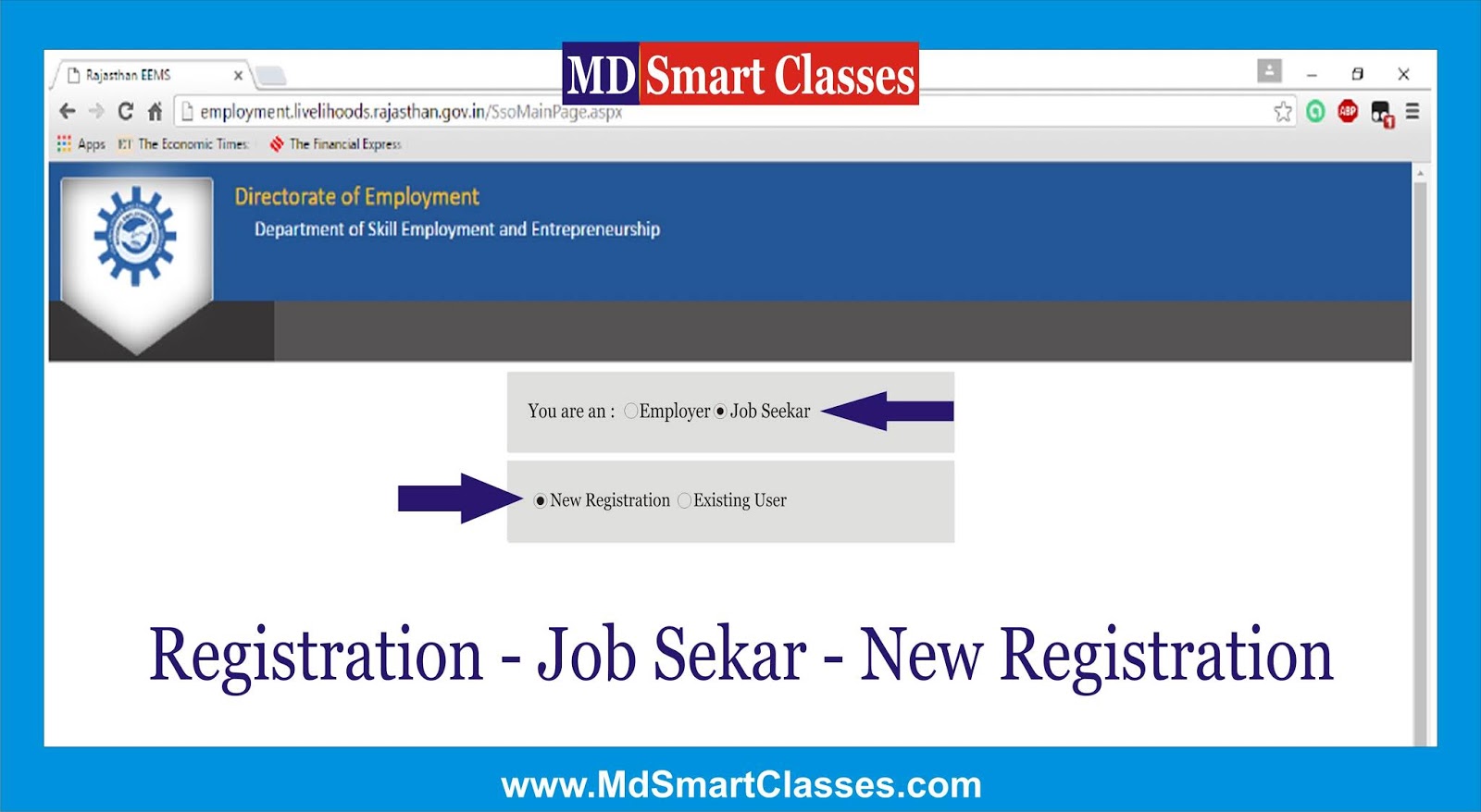 3. रजिस्ट्रशन करे – अगर आप पहली बार आवेदन कर रहे है तो Job seekar पर क्लिक करे  उसके बाद New Registration पर क्लिक करे और आपने पहले से ही रजिस्ट्रशन कर रखा है तो Exiting user पर क्लिक करे |