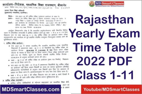राजस्थान मे वार्षिक परीक्षाओं का टाइम टेबल जारी (Rajasthan Yearly Exam Time Table 2022) : राजस्थान के सरकारी और गैर सरकारी स्कूलों मे आयोजित होने वाली वार्षिक परीक्षाओं का टाइम टेबल जारी कर दिया है । राजस्थान मे वार्षिक परीक्षाओं का आयोजन 28 अप्रैल से 11 मई 2022 के मध्य आयोजित होगा । कक्षा 1 से 4, 6 व 7 के लिये विद्यालय स्तर पर तथा कक्षा 09 व 11 हेतु वार्षिक परीक्षा का आयोजन समान परीक्षा को लेकर महत्वपूर्ण दिशा निर्देश जारी। निर्देशों की ऑफिशियल पीडीएफ फाइल डाउनलोड करने का लिंक नीचे पोस्ट के अंत में दिया गया है।