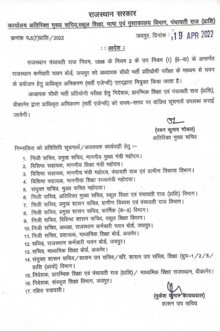 राजस्थान पंचायती राज नियन, 1996 के नियम 2 के उप नियम (1) (ii- क) के अन्तर्गत राजस्थान कर्मचारी चयन बोर्ड, जयपुर को अध्यापक सीधी भर्ती प्रतियोगी परीक्षा (REET 2nd Paper Exam Agency) के माध्यम से चयन के प्रयोजन हेतु प्राधिकृत अभिकरण (भर्ती एजेन्सी) एतद्द्वारा नियुक्त किया जाता है। अध्यापक सीधी भर्ती प्रतियोगी परीक्षा हेतु निदेशक, प्रारम्भिक शिक्षा एवं पंचायती राज (प्राशि), बीकानेर द्वारा प्राधिकृत (भर्ती एजेन्सी) को समय-समय पर वांछित सूचनायें उपलब्ध कराई जायेगी।