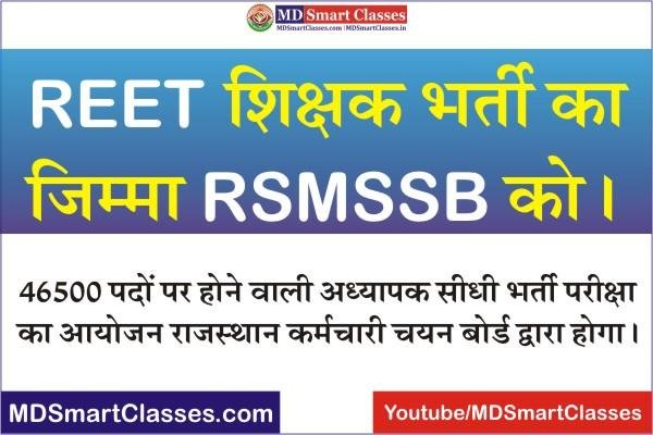 रीट शिक्षक भर्ती परीक्षा का जिम्मा कर्मचारी चयन बोर्ड को (REET Main Exam Conduct by RSMSSB) : राजस्थान मे आयोजित होने रीट 2022 पात्रता परीक्षा के बाद होने शिक्षक भर्ती के मुख्य पेपर के लिए राजस्थान सरकार ने REET 2nd Paper Exam Agency के लिए राजस्थान कर्मचारी चयन बोर्ड को जिम्मा सौंपा है । आपको बता दे रीट 2022 परीक्षा 46500 पदों के आयोजित की जाएगी । रीट 2022 के ऑनलाइन आवेदन चालू है । रीट पात्रता परीक्षा के बाद रीट 2022 योग्य अभ्यर्थी मुख्य परीक्षा मे भाग ले सकेंगे ।