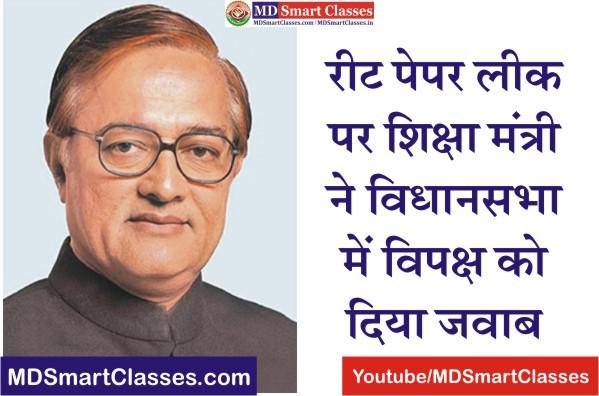 रीट पेपर लीक केस पर विपक्ष के प्रश्नों का शिक्षा मंत्री ने विधानसभा मे दिया जवाब (REET Paper Leak Case) : राजस्थान विधानसभा के बजट सत्र के दौरान विपक्ष द्वारा पूछे गए रीट पेपर लीक केस के प्रश्नों का विधानसभा मे दिया जवाब । रीट लेवल 1 परीक्षा नहीं होगी रद्द । रीट लेवल 1 शिक्षकों को जल्द ही मिलेगी नियुक्ति । रीट 2022 की विज्ञप्ति मार्च 2022 बाद संभव ।