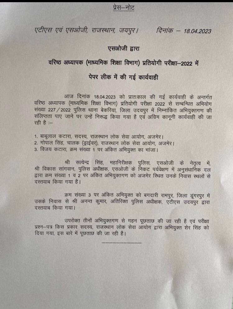 आपको बता दे आयोग द्वारा 24 दिसंबर 2022 को आयोजित होने वाले ग्रुप सी के सामान्य अध्ययन के पेपर को निरस्त कर दिया था । जब आयोग को उदयपुर से पेपर लीक के बारे मे इनपुट मिला तो आयोग ने बिना देर किये ही परीक्षा प्रारंभ होने से आधे घंटे पहले ही पेपर को निरस्त कर दिया । इसके बाद इस पेपर की दुबारा परीक्षा 29 जनवरी को आयोजित की गई ।
