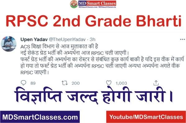 राजस्थान सेकंड ग्रेड टीचर भर्ती 2022 लेटेस्ट अपडेट (RPSC 2nd Grade Teacher Bharti 2022 Latest Update) : राजस्थान बेरोजगार एकीकृत महासंघ के अध्यक्ष उपेन यादव के नेतृत्व में बेरोजगारों ने शिक्षा विभाग के एसीएस से मुलाकात की। यादव ने बताया कि नई सेकंड ग्रेड भर्ती की अभ्यर्थना आज आरपीएससी चली जाएगी और फर्स्ट ग्रेड भर्ती की अभ्यर्थना का रोस्टर से संबंधित कुछ कार्य बाकी है यदि इस वीक में कार्य हो गया तो फर्स्ट ग्रेड भर्ती की अभ्यर्थना RPSC चली जाएगी अन्यथा अभ्यर्थना अगले वीक RPSC जाएगी l
