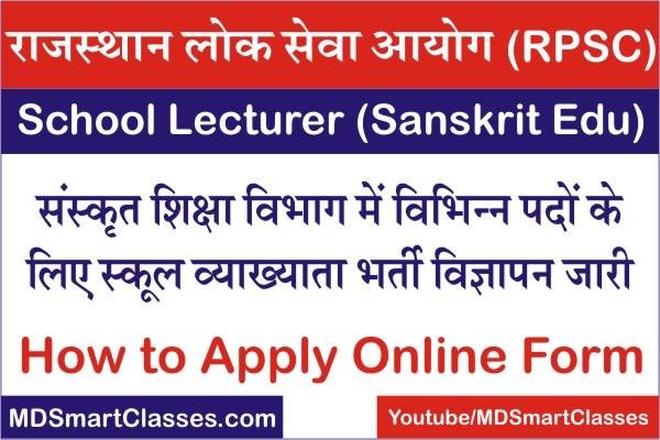 राजस्थान संस्कृत विभाग स्कूल व्याख्याता भर्ती 2022 (RPSC Sanskrit School Lecturer Bharti 2022) : राजस्थान लोक सेवा आयोग ने संस्कृत शिक्षा विभाग मे रिक्त पदों पर स्कूल व्याख्याता भर्ती विज्ञापन जारी कर दिया है । स्कूल व्याख्याता के 102 पदों पर भर्ती के लिए आयोग ने विज्ञप्ति जारी कर दी है । के लिए ऑनलाइन आवेदन 16 मई से 14 जून 2022 तक भरे जाएंगे । आरपीएससी फर्स्ट ग्रेड भर्ती 2022 के लिए योग्यता, आयु सीमा, एप्लीकेशन फीस व अन्य संपूर्ण जानकारी नीचे दी गई है अभ्यर्थी आवेदन करने से पूर्व एक बार ऑफिशल नोटिफिकेशन अवश्य देख लें। इस पोस्ट में स्कूल व्याख्याता भर्ती से संबंधित सम्पूर्ण जानकारी उपलब्ध करवाई गई है।