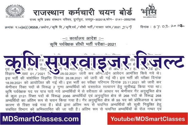 राजस्थान कृषि पर्यवेक्षक रिजल्ट 2021 जारी (RSMSSB Agriculture Supervisor Result 2021) : कृषि विभाग राजस्थान के लिए राजस्थान कृषि अधीनस्थ सेवा नियम, 1978 यथा संशोधित तथा राजस्थान अनुसूचित क्षेत्र अधीनस्थ मंत्रालयिक एवं चतुर्थ श्रेणी सेवा (भर्ती एवं सेवा की अन्य शर्ते) नियम-2014 के अन्तर्गत कृषि पर्यवेक्षक सीधी भर्ती परीक्षा-2021 के गैर अनुसूचित क्षेत्र के लिए 2121 एवं अनुसूचित क्षेत्र के लिए 268 पदों पर भर्ती हेतु संबंधित विभाग से अर्थना प्राप्त होने पर बोर्ड द्वारा विज्ञापन संख्या 01/ 2021 दिनांक 05.02.2021 जारी कर ऑनलाईन आवेदन आमंत्रित किये गये थे।