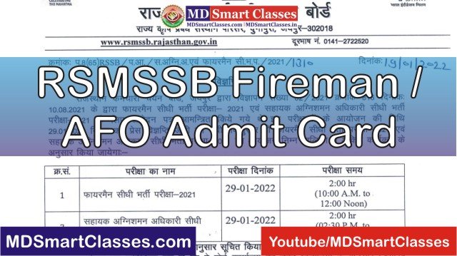 राजस्थान फायरमेन एडमिट कार्ड जारी (RSMSSB Fireman Admit Card 2021) : राजस्थान कर्मचारी चयन बोर्ड, जयपुर द्वारा आयोजित फायरमैन सीधी भर्ती परीक्षा- 2021 एवं सहायक अग्निशमन अधिकारी सीधी भर्ती परीक्षा- 2021 के लिए आवेदन पत्र आमन्त्रित किये गये थे । इन परीक्षाओं के आयोजन की तिथि 29.01.2022 नियत कर प्रेस विज्ञप्ति जारी की गयी । इसके अनुसार फायरमैन सीधी भर्ती परीक्षा – 2021 का आयोजन सुबह 10 बजे से 12 बजे एवं सहायक अग्निशमन अधिकारी सीधी भर्ती परीक्षा-2021 का आयोजन शाम 2:30 बजे से 4:30 बजे तक किया जायेगा । प्रत्येक पारी 2 घंटे की होगी।