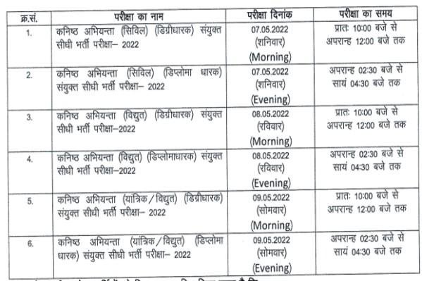 राजस्थान कर्मचारी चयन बोर्ड, जयपुर द्वारा विज्ञापन संख्या 01/2022 क्रमांक दिनांक: 77 17.01.2022, संशोधित विज्ञप्ति क्रमांक 280 दिनांक 14.03.2022 के द्वारा कनिष्ठ अभियंता संयुक्त सीधी भर्ती परीक्षा- 2022 के लिए आवेदन पत्र आमन्त्रित किये गये थे तदान्तर्गत बोर्ड द्वारा इन परीक्षाओं का आयोजन निम्न तालिका में अंकित कार्यक्रम के अनुसार किया जायेगाः