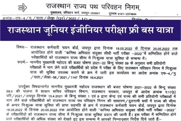 उपर्युक्त विषयान्तर्गत माननीय मुख्यमंत्री महोदय राजस्थान की बजट घोषणा 2021 2022 के बिन्दु संख्या 59.0 की पालना में शासन सचिव परिवहन विभाग, राजस्थान सरकार, जयपुर के आदेश क्रमांक प.17 (5) परि / 2021 / जयपुर दिनांक 15.4.2021 के बिन्दु संख्या 1 एवं 8 द्वारा केन्द्र एवं राज्य की सभी प्रतियोगी परीक्षाओं में भाग लेने वाले परीक्षार्थियों को राजस्थान राज्य पथ परिवहन निगम की साधारण / द्रुतगामी बसों में राज्य की सीमा के अन्दर निःशुल्क यात्रा सुविधा की प्राप्त सहमति के क्रम में राजस्थान कर्मचारी चयन बोर्ड, जयपुर द्वारा दिनांक 18.05.2022 से दिनांक 20.05.2022 तक आयोजित होने वाली “कनिष्ठ अभियंता सयुक्त सीधी भर्ती परीक्षा -2022” के परीक्षार्थियों को राजस्थान राज्य सीमा में निःशुल्क यात्रा सुविधा प्रदान की जानी है। इस परीक्षा में सम्मिलित होने वाले परीक्षार्थियों की अधिक संख्या को देखते हुए इस सम्बन्ध में आपको निम्नानुसार निर्देश दिये जाते हैं: