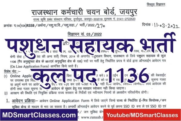 राजस्थान पशुधन सहायक भर्ती 2022 (Rajasthan Pashudhan Sahayak Bharti 2022) : पशुपालन विभाग, राजस्थान के लिये पशुधन सहायक के कुल 1136 (गैर अनुसूचित क्षेत्र के 981एवं अनुसूचित क्षेत्र के 155) पदों पर भर्ती हेतु विज्ञापन जारी करके ऑनलाईन आवेदन पत्र (RSMSSB LSA Bharti 2022) आमंत्रित किये जाते हैं। इच्छुक व योग्य उम्मीदवार इन पदों पर ऑनलाइन आवेदन कर सकते है।
