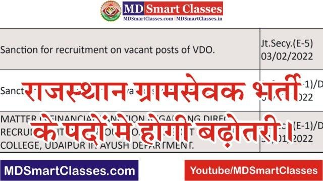 राजस्थान ग्राम सेवक भर्ती मे होगी पदों की बढ़ोतरी (RSMSSB VDO Result Latest News 2021) : राजस्थान कर्मचारी चयन बोर्ड द्वारा जारी विज्ञप्ति राजस्थान ग्राम विकास अधिकारी भर्ती 3896 पदों पर आयोजित की जा रही है । राजस्थान कर्मचारी चयन बोर्ड द्वारा राजस्थान ग्राम विकास अधिकारी परीक्षा (राजस्थान ग्राम सेवक परीक्षा) का आयोजन 27 व 28 दिसम्बर 2021 को किया जा चुका । इस बार बोर्ड ने राजस्थान ग्राम सेवक परीक्षा को 2 चरणों मे आयोजित कर रहा है । हाल ही मे राजस्थान कर्मचारी चयन बोर्ड ने विभाग मे रिक्त पड़े हुए पदों की अभ्यर्थना के लिए सरकार को पत्र लिखा था ।