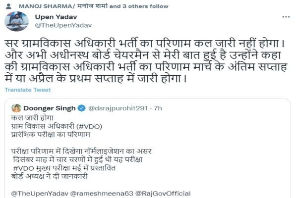 उपेन यादव ने एक पत्रकार महोदय के गलत ट्वीट के जवाब मे कहा कि ग्रामविकास अधिकारी भर्ती का परिणाम कल जारी नहीं होगा l और अभी अधीनस्थ बोर्ड चेयरमैन से मेरी बात हुई है उन्होंने कहा की ग्रामविकास अधिकारी भर्ती का परिणाम मार्च के अंतिम सप्ताह में या अप्रैल के प्रथम सप्ताह में जारी होगा l अभ्यर्थियों को सूचित किया जाता है इस परीक्षा के लिए रिजल्ट (RSMSSB VDO Bharti 2021 Result) बोर्ड की आधिकारिक वेबसाईट पर डाउनलोड करने होंगे जिसका लिंक आपको नीचे भी दिया गया है । बोर्ड जल्द ही इस परीक्षा के लिए रिजल्ट जारी करेगा जिसकी सूचना अलग से दी जाएगी । अभ्यर्थियों की सुविधा के लिए हम इसका लिंक नीचे उपलब्ध करवा रहे है ।